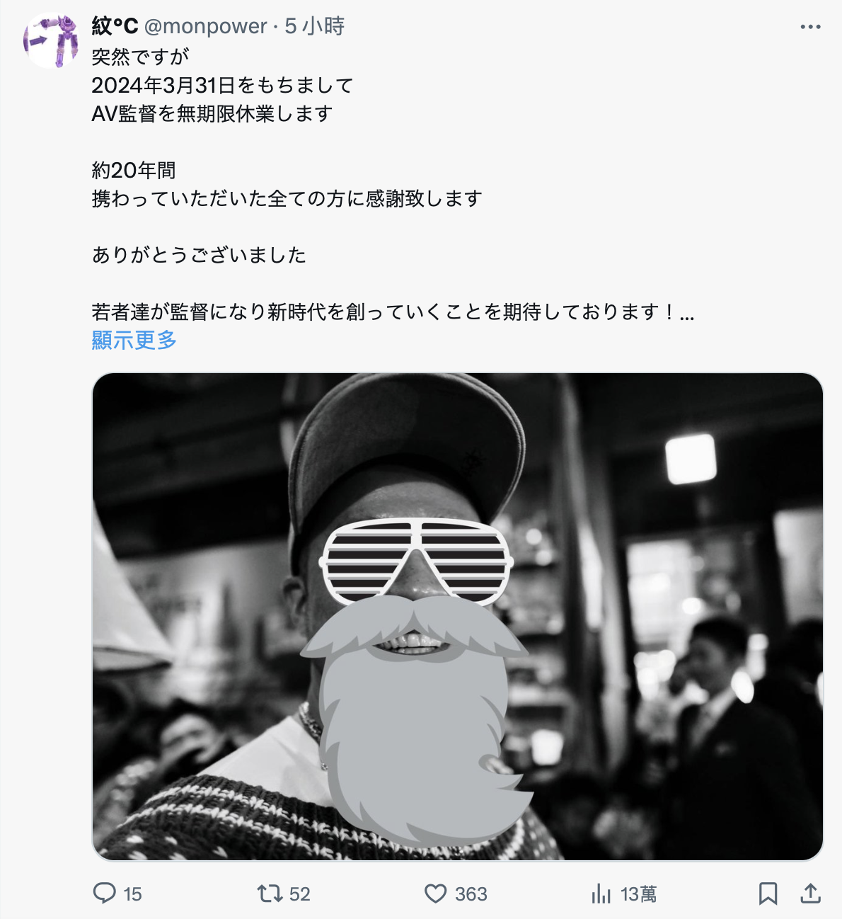 我简单翻一下他的发文,为什么是简单翻?因为纹℃也只是简单写,他说虽然事出突然,但他决定自4月起无限期休业不做AV导演了,非常感谢大家在这20年间的帮忙,也期待年轻的监督能开创新时代ー